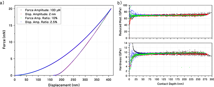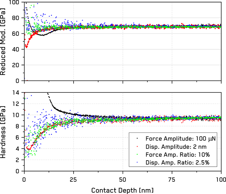 采用连续刚度测量(CSM)的纳米压痕测试为研究力学性能随压入深度的变化提供了一种快速、局部化的方法。该方法通常采用 2 nm 的恒定位移振幅来实现。然而,在小深度下,由于该振幅的相对量级较大,可能会对测量结果产生显著影响。本应用笔记探讨了恒定载荷振幅与恒定位移振幅之间的关系,并验证了比例缩放振幅比CSM模式在全深度范围内均能提供更优异的测试结果。